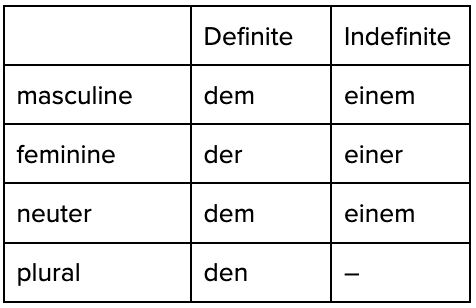 The object that follows could be in either the accusative, the dative or the genitive. But in this case our object is in the dative – and if you read to the end, you’ll see why. But for now it’s going to be enough for us to recognise that there is a difference between a direct object and a prepositional object.