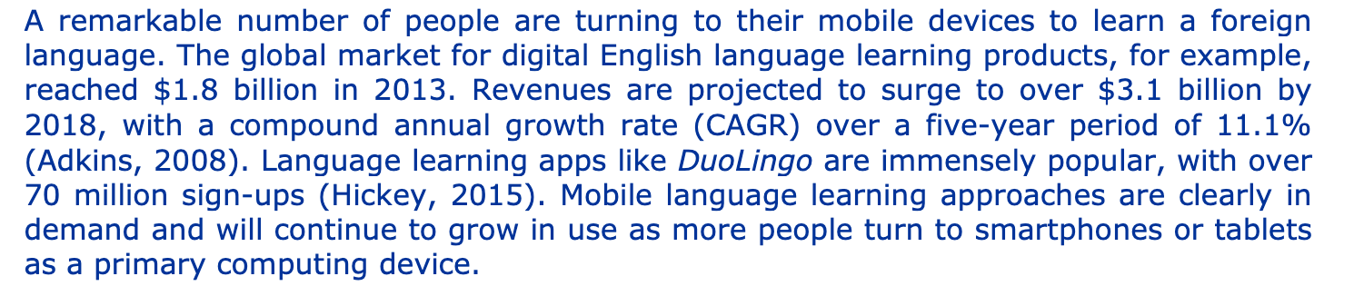 Our review has shown that, in the commercial app space, there is a predominant focus on teaching language as isolated vocabulary words rather than contextualized usage. Most use drill-like mechanisms and offer very little explanatory corrective feedback, and there is little adaptation to the needs of individual learners. Despite advances in language teaching that have stressed the importance of communicative competence in language learning, MALL technology is still primarily utilized for vocabulary instruction rather than fluency-building.5