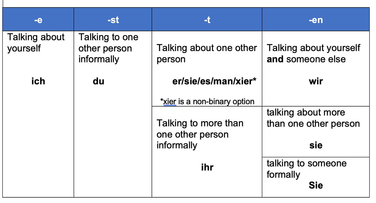 But, when we use these verbs in a sentence, we need to use the right ending. And the ending depends on who or what the subject is. Because, we could be talking about ourselves, talking to others or about others. But, there only are four different verb endings.